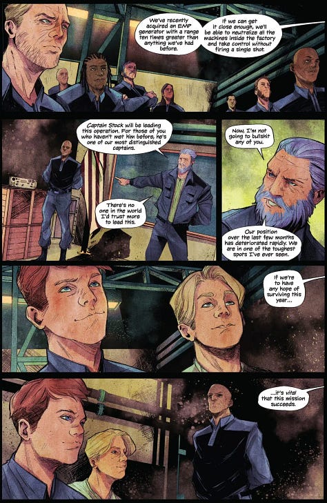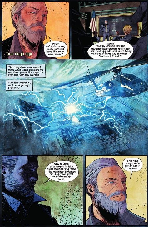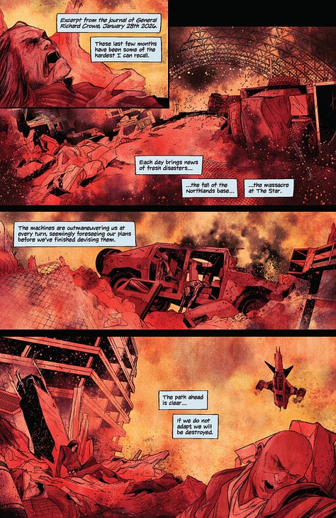 Issue Four of TERMINATOR: METAL come out last week. Here’s the preview pages by Rory McConville, Fabio Gallo, Colin Craker and Jeff Eckleberry. It’s a tense war-time story focusing on Resistence fighters making a desperate play to take out a Skynet base. As usual, everything goes according to plan and works out for the best.