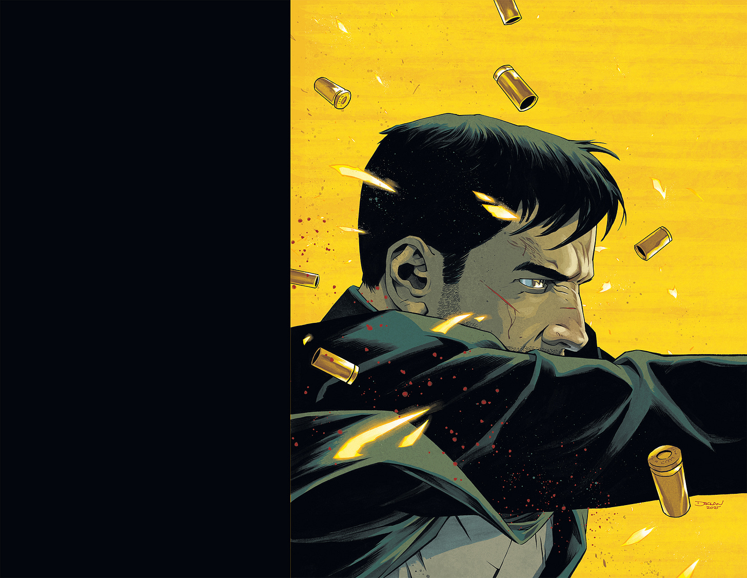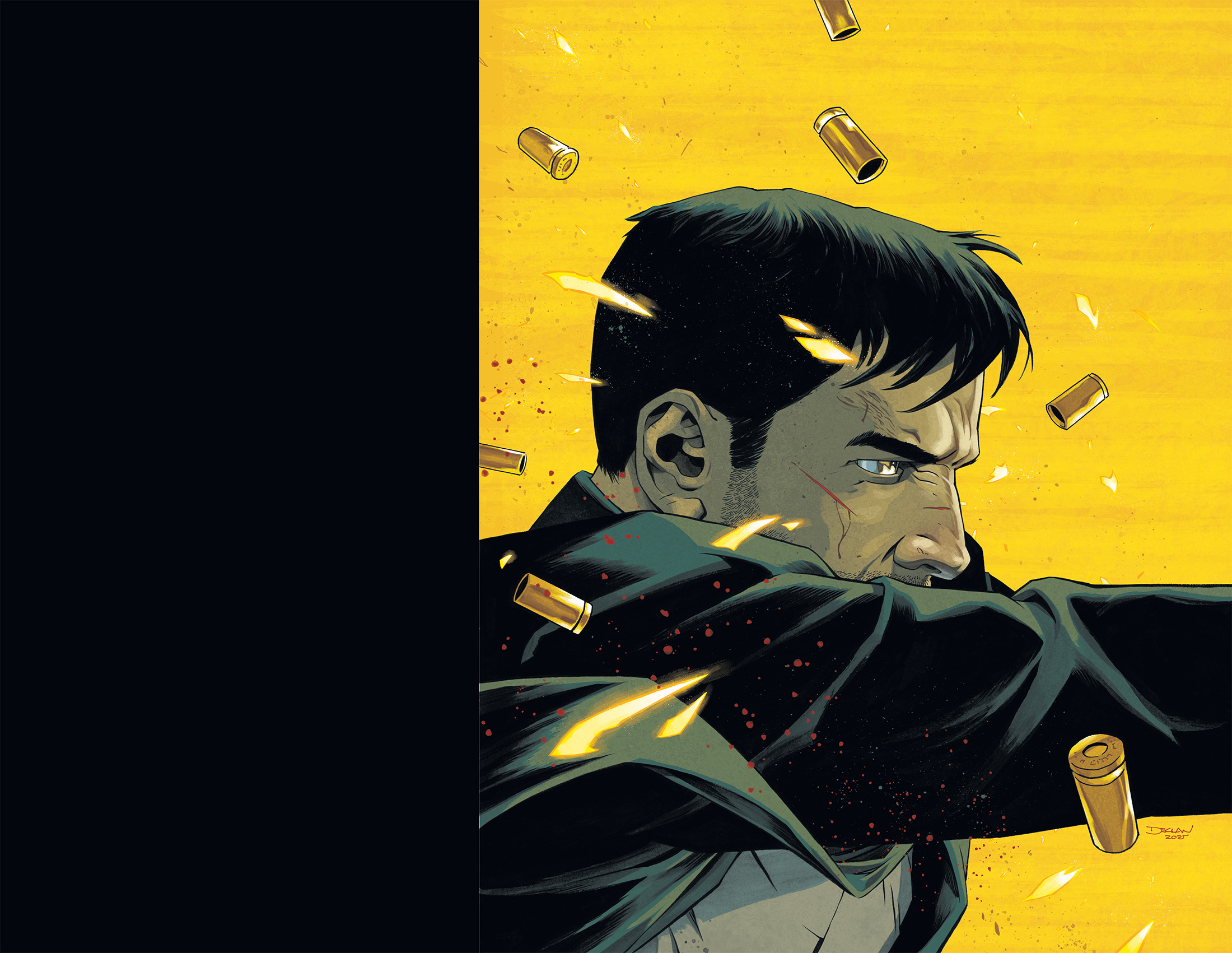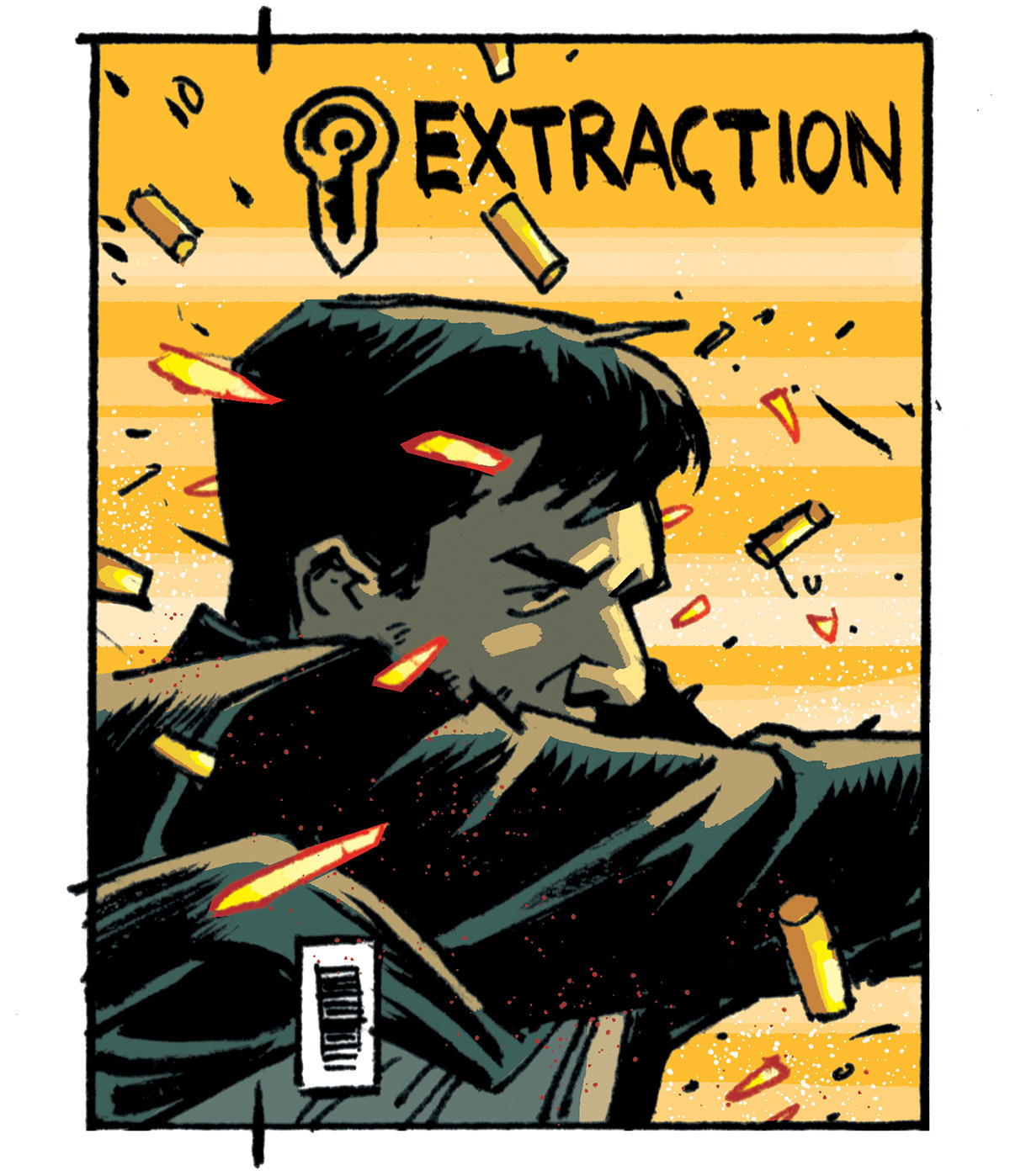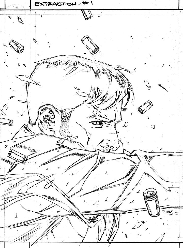 The covers are for TYLER RAKE: AN EXTRACTION STORY, a new miniseries written by Ande Parks, drawn by Ronan Cliquet based off the original Extraction novels. I quite enjoyed the movies and was keen to take this on. Ignition had a specific brief for the covers but were also very open for me to create an identity for the series. I’m always eager to work on projects like that. For me, the issue was doing covers for a known IP, but not use an actor’s likeness, while also creating some kind of identifying elements that will catch the readers eyes. There is no symbol to use, no recognisable likeness or character design/costume to lean into …so I had to make one. I decided that with each cover, I would limit the colour scheme to a spectum of yellow, red and a dark blue. I would obscure the main character’s face and would make the compositions as bold as possible. I felt I wanted to channel my PUNISHER cover work on something like this. My goal being that with each issue that comes out, you can tell this is an EXTRACTION cover. I tried to take my limitations and flip them in order to create identifiers of some kind.
